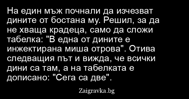 На един мъж почнали да изчезват дините от бостана му. Решил, за да не хваща крадеца, само да сложи табелка: "В една от дините е инжектирана миша отрова". Отива следващия път и вижда, че всички дини са там, а на табелката е дописано: "Сега са две".