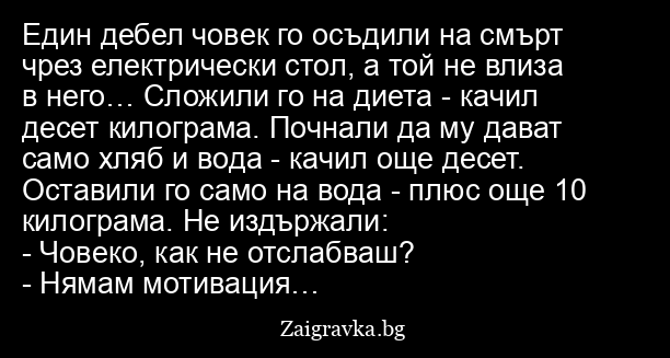 Един дебел човек го осъдили на смърт чрез електрически стол, а той не влиза в него… Сложили го на диета - качил десет килограма. Почнали да му дават само хляб и вода - качил още десет. Оставили го само на вода - плюс още 10 килограма. Не издържали:
