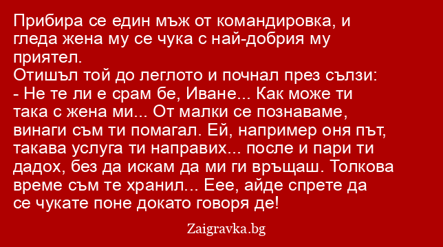 - Не те ли е срам бе, Иване... Как може ти така с жена ми... От малки се познаваме, винаги съм ти помагал. Ей, например оня път, такава услуга ти направих... после и пари ти дадох, без да искам да ми ги връщаш. Толкова време съм те хранил... Еее, айде спрете да се чукате поне докато говоря де!