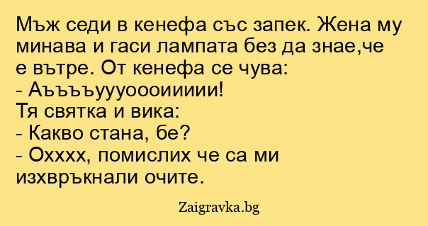 Мъж седи в кенефа със запек. Жена му минава и гаси лампата без да знае,че е вътре. От кенефа се чува: