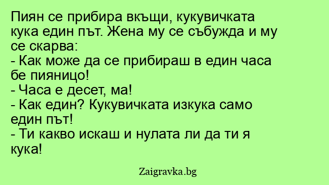 Пиян се прибира вкъщи, кукувичката кука един път. Жена му се събужда и му се скарва: