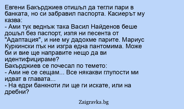Евгени Бакърджиев отишъл да тегли пари в банката, но си забравил паспорта. Касиерът му казва: