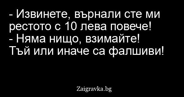 - Извинете, върнали сте ми рестото с 10 лева повече!