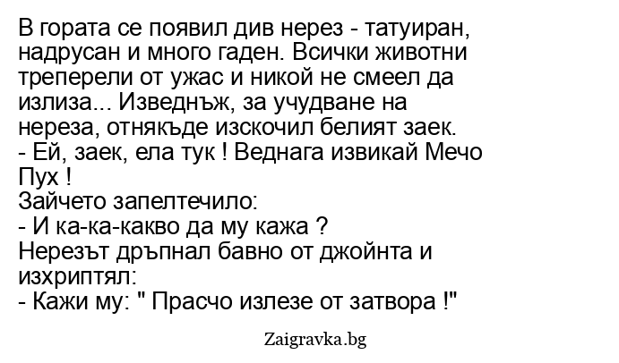 В гората се появил див нерез - татуиран, надрусан и много гаден. Всички животни треперели от ужас и никой не смеел да излиза... Изведнъж, за учудване на нереза, отнякъде изскочил белият заек.