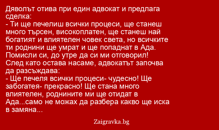 - Ще печеля всички процеси- чудесно! Ще забогатея- прекрасно! Ще стана много влиятелен, роднините ми ще отидат в Ада...само не можах да разбера какво ще иска в замяна...
