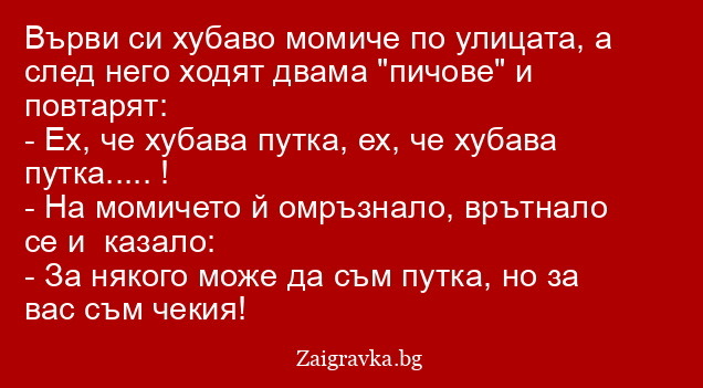 Върви си хубаво момиче по улицата, а след него ходят двама "пичове" и повтарят: