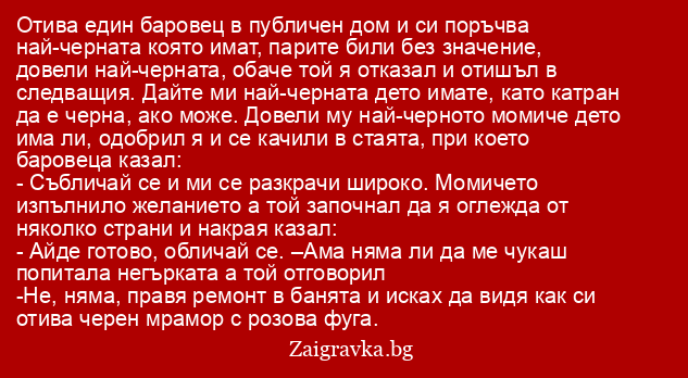 Отива един баровец в публичен дом и си поръчва най-черната която имат, парите били без значение, довели най-черната, обаче той я отказал и отишъл в следващия. Дайте ми най-черната дето имате, като катран да е черна, ако може. Довели му най-черното момиче дето има ли, одобрил я и се качили в стаята, при което баровеца казал:
