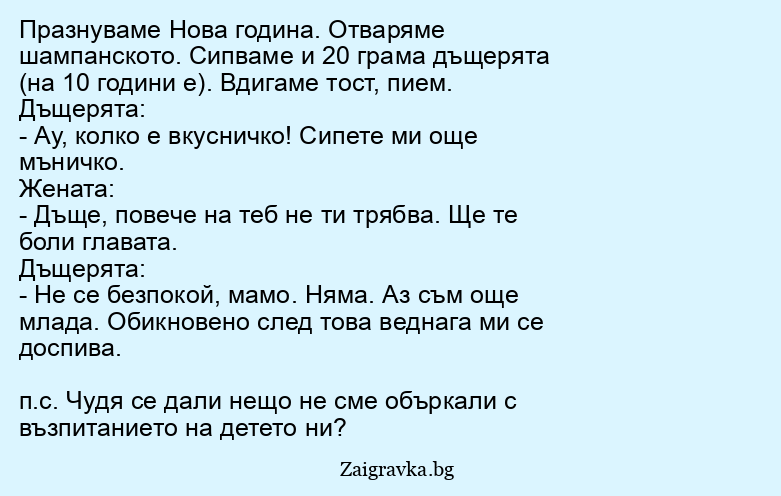 Празнуваме Нова година. Отваряме шампанското. Сипваме и 20 грама дъщерята (на 10 години е). Вдигаме тост, пием.