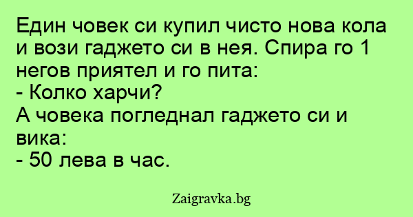 Един човек си купил чисто нова кола и вози гаджето си в нея. Спира го 1 негов приятел и го пита: