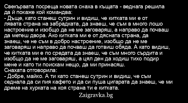- Дъще, като станеш сутрин и видиш, че китката ми е от лявата страна на забрадката, да знаеш, че съм в много лошо настроение и изобщо да не ме заговаряш, а направо да почваш да метеш двора. Ако китката ми е от дясната страна, да знаеш, че не съм в добро настроение, изобщо да не ме заговаряш и направо да почваш да готвиш обяда. А като видиш, че китката ми е по средата да знаеш, че съм много сърдита и изобщо да не ме заговаряш, а цял ден да ходиш тихо подир мене и като ти поискам нещо, да ми принасяш.