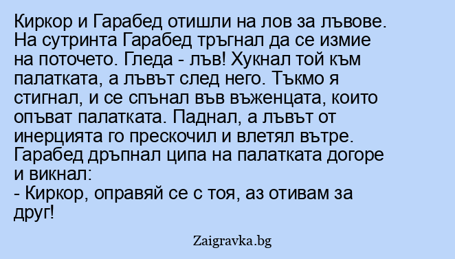 Киркор и Гарабед отишли на лов за лъвове. На сутринта Гарабед тръгнал да се измие на поточето. Гледа - лъв! Хукнал той към палатката, а лъвът след него. Тъкмо я стигнал, и се спънал във въженцата, които опъват палатката. Паднал, а лъвът от инерцията го прескочил и влетял вътре. Гарабед дръпнал ципа на палатката догоре и викнал: