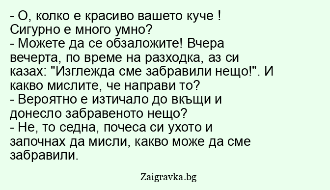 - О, колко е красиво вашето куче ! Сигурно е много умно?
