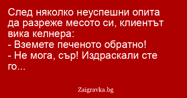 След няколко неуспешни опита да разреже месото си, клиентът вика келнера: