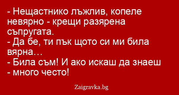 - Нещастнико лъжлив, копеле невярно - крещи разярена съпругата.