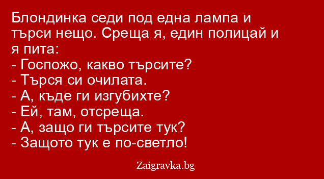 На един самотен остров останали три блондинки. Те намерили една магическа лампа, потъркали я и от нея излязъл дух. Той им казал, че ще им изпълни и на трите по едно желание. Първата си пожелала да е в мола на София, пуф и изчезнала. Втората си пожелала да е в апартамента си в Бразилия, пуф и изчезнала. А, третата се замислила и казала: