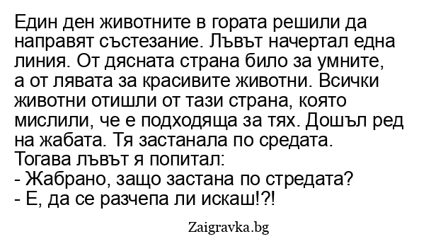Един ден животните в гората решили да направят състезание. Лъвът начертал една линия. От дясната страна било за умните, а от лявата за красивите животни. Всички животни отишли от тази страна, която мислили, че е подходяща за тях. Дошъл ред на жабата. Тя застанала по средата. Тогава лъвът я попитал: