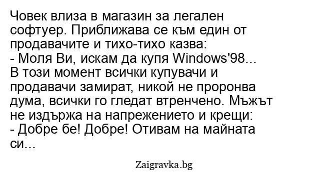 Човек влиза в магазин за легален софтуер. Приближава се към един от продавачите и тихо-тихо казва: