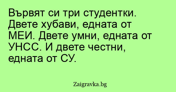 Вървят си три студентки. Двете хубави, едната от МЕИ. Двете умни, едната от УНСС. И двете честни, едната от СУ.