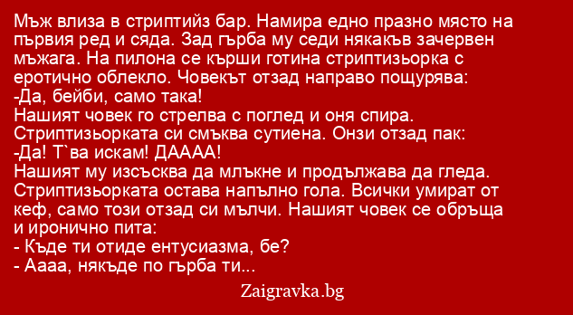 Мъж влиза в стриптийз бар. Намира едно празно място на първия ред и сяда. Зад гърба му седи някакъв зачервен мъжага. На пилона се кърши готина стриптизьорка с еротично облекло. Човекът отзад направо пощурява: