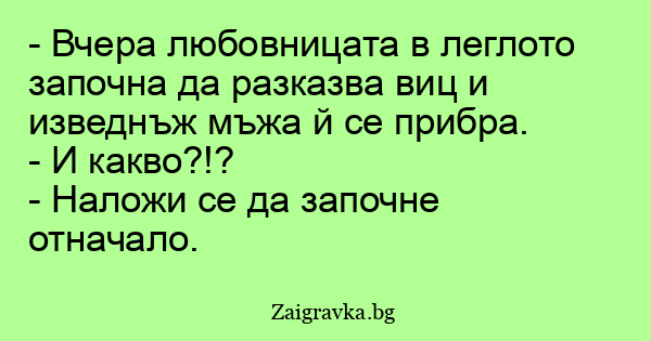 - Вчера любовницата в леглото започна да разказва виц и изведнъж мъжа й се прибра.