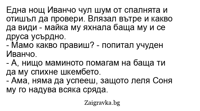 Една нощ Иванчо чул шум от спалнята и отишъл да провери. Влязал вътре и какво да види - майка му яхнала баща му и се друса усърдно.