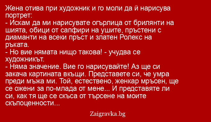 - Няма значение. Вие го нарисувайте! Аз ще си закача картината вкъщи. Представете си, че умра преди мъжа ми. Той, естествено, женкар мръсен, ще се ожени за по-млада от мене... И представяте ли си, как тя ще се скъса от търсене на моите скъпоценности...