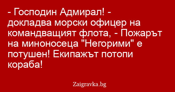- Господин Адмирал! - докладва морски офицер на командващият флота, - Пожарът на миноносеца "Негорими" е потушен! Екипажът потопи кораба!