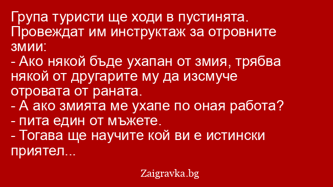 - А ако змията ме ухапе по оная работа? - пита един от мъжете.