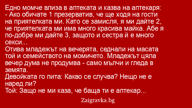 Едно момче влиза в аптеката и казва на аптекаря: