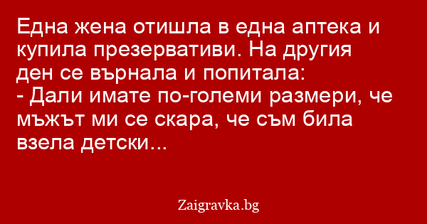 Една жена отишла в една аптека и купила презервативи. На другия ден се върнала и попитала:
