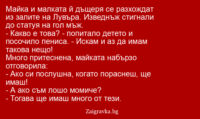 Майка и малката й дъщеря се разхождат из залите на Лувъра. Изведнъж стигнали до статуя на гол мъж.