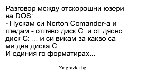 - Пускам си Norton Comander-а и гледам - отляво диск С: и от дясно диск С: ... и си викам за какво са ми два диска С:.