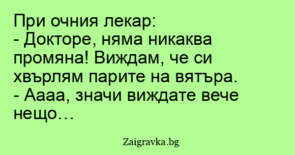 - Докторе, няма никаква промяна! Виждам, че си хвърлям парите на вятъра.