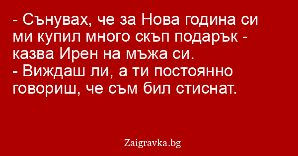 - Сънувах, че за Нова година си ми купил много скъп подарък - казва Ирен на мъжа си.