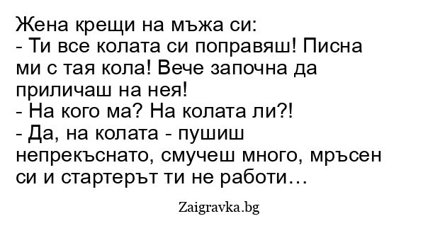 - Ти все колата си поправяш! Писна ми с тая кола! Вече започна да приличаш на нея!