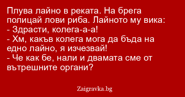 Плува лайно в реката. На брега полицай лови риба. Лайното му вика: