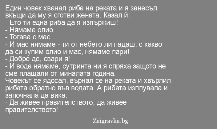 Един човек хванал риба на реката и я занесъл вкъщи да му я сготви жената. Казал й: