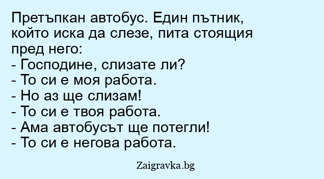 Претъпкан автобус. Един пътник, който иска да слезе, пита стоящия пред него: