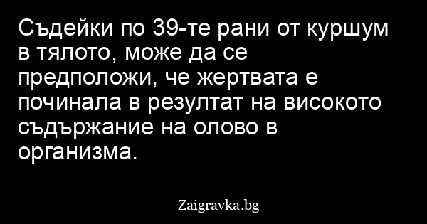 Съдейки по 39-те рани от куршум в тялото, може да се предположи, че жертвата е починала в резултат на високото съдържание на олово в организма.