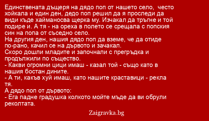 Единствената дъщеря на дядо поп от нашето село, често хойкала и един ден, дедо поп решил да я проследи да види къде хайманосва щерка му. Изчакал да тръгне и той подире и. А тя - на ореха в полето се срещала с попския син на попа от съседно село.
