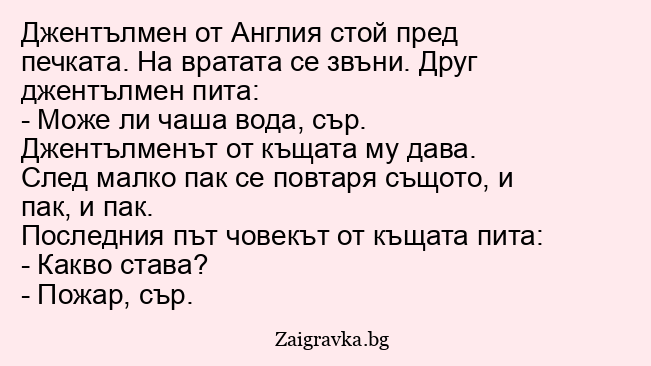 Джентълмен от Англия стой пред печката. На вратата се звъни. Друг джентълмен пита: