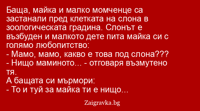 Баща, майка и малко момченце са застанали пред клетката на слона в зоологическата градина. Слонът е възбуден и малкото дете пита майка си с голямо любопитство: