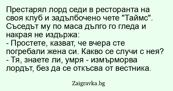 Престарял лорд седи в ресторанта на своя клуб и задълбочено чете "Таймс". Съседът му по маса дълго го гледа и накрая не издържа: