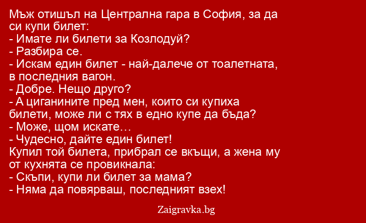 - Искам един билет - най-далече от тоалетната, в последния вагон.