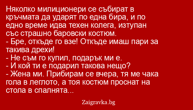 - Жена ми. Прибирам се вчера, тя ме чака гола в леглото, а тоя костюм проснат на стола в спалнята...