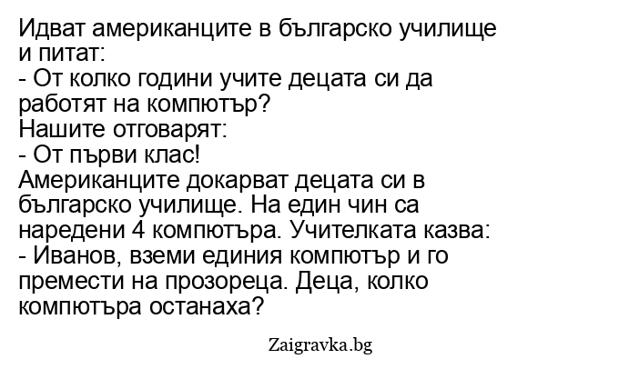 Американците докарват децата си в българско училище. На един чин са наредени 4 компютъра. Учителката казва: