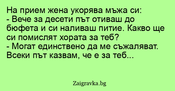 - Вече за десети път отиваш до бюфета и си наливаш питие. Какво ще си помислят хората за теб?
