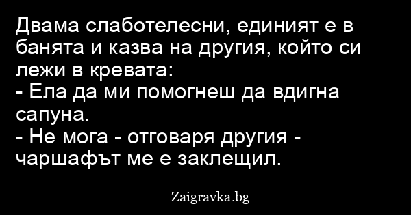 Двама слаботелесни, единият е в банята и казва на другия, който си лежи в кревата: