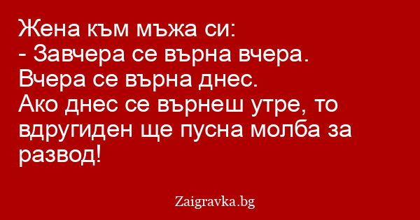 Ако днес се върнеш утре, то вдругиден ще пусна молба за развод!