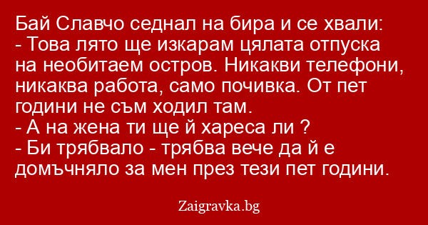 - Това лято ще изкарам цялата отпуска на необитаем остров. Никакви телефони, никаква работа, само почивка. От пет години не съм ходил там.